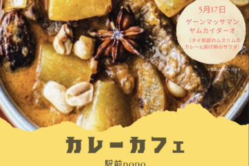 今週のカレーランチはタイ南部のムスリムのカレー! テイクアウトも可能で … 続きを読む 5月17日(金)の駅前popoカレーカフェのメニューのお知らせ